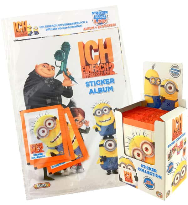 Starter Pack (German version) + box with 50 packets for the sticker collection "Ich Einfach unverbesserlich 2". Each packet contains 5 stickers.