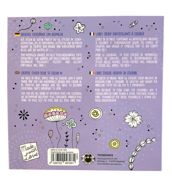 On 10 pages you will find 46 stickers in silver finish, which you can design and colour individually. Be creative and unique and embellish and label everything that is important to you. You can use different pens to colour in the stickers. We would recommend ballpoint pens, fineliners, fibre-tip pens, foil pens, felt-tip pens and gel pens.