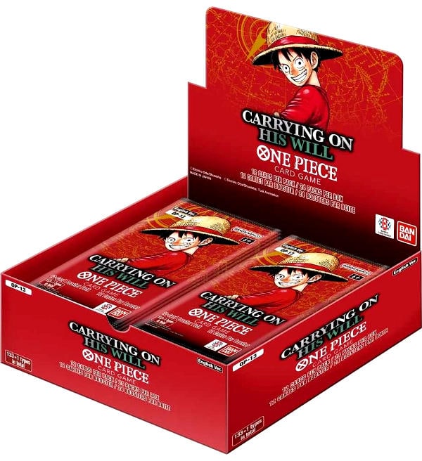 Box with 24 packets of "One Piece Card Game - Carrying On His Will OP-13" collection. Each booster contains 12 cards, which makes a total number of 288 cards per box.