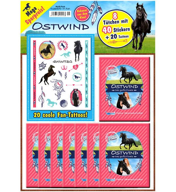 Multipack for the sticker collection "Ostwind Das grosse Finale" with 8 packets + 20 tattoos. Each packet contains 5 stickers.