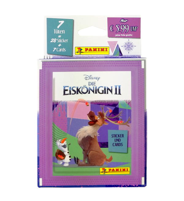 Blister with 7 packets for the Panini Disney Frozen 2 - Two Paths One Band - Stickers + Cards collection (2021). Each packet contains 4 stickers + 1 card.