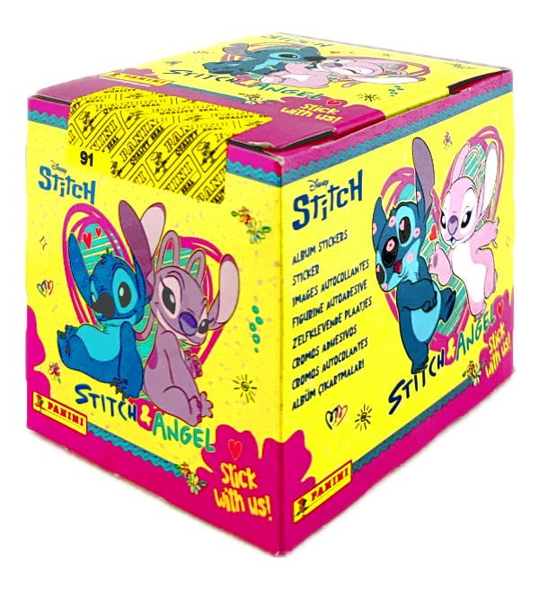 Box with 36 packets for the Panini Disney Stitch - Stitch & Angel stickers collection (2026). Each packet contains 5 stickers.