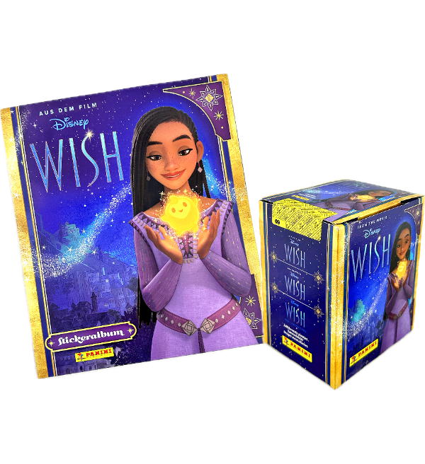 German Album + Box with 36 packets for the Panini Disney Wish stickers collection (2023). Each packet contains 5 stickers.