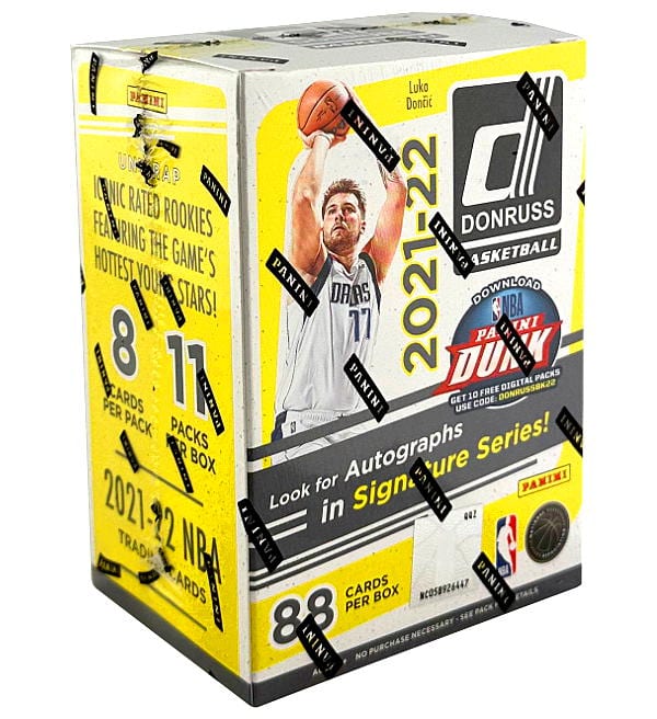 Blaster Box with 11 packets for "Panini Donruss Basketball NBA 2021/22" Trading Card collection. Each booster contains 8 cards, which makes a total number of 88 cards per box.