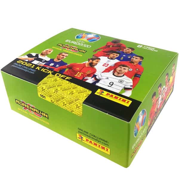 International box with 24 boosters of Panini EURO 2020 Adrenalyn XL 2021 KICK OFF trading card series. Each booster contains 8 cards, which makes a total number of 192 cards per box.
