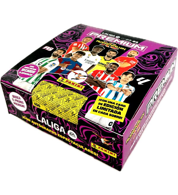 Premium Box with 20 packets for "Panini LaLiga Adrenalyn XL 2023-24" Trading Card collection. Each booster contains 10 cards (1 Limited Edition Card, 4 Special Cards, 5 Base Cards).