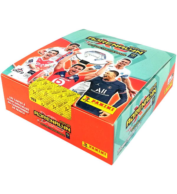 Box with 18 packets for "Panini Ligue 1 Adrenalyn XL 2021-22" Trading Card collection. Each booster contains 8 cards, which makes a total number of 144 cards per box.