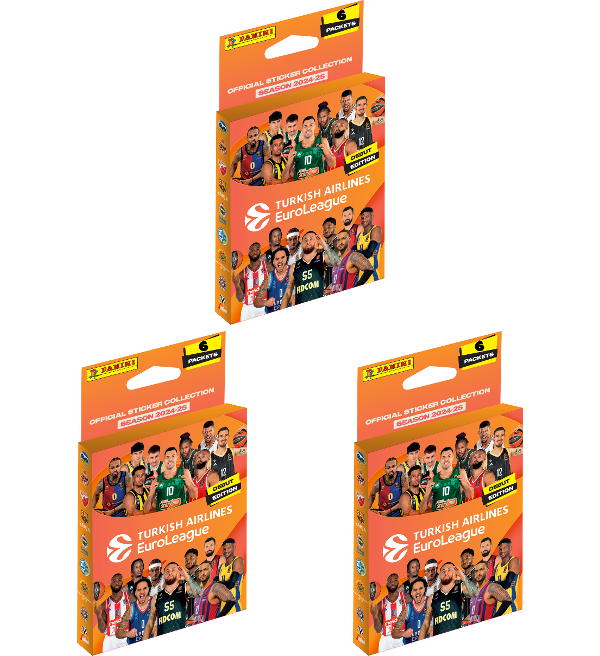 3 Eco-Blister (=18 packets) for the sticker collection "Panini Turkish Airlines EuroLeague 2024-25". Each packet contains 5 stickers.