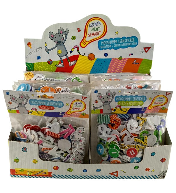Display with 18 pieces of foam rubber learning stickers Numbers & arithmetic signs (9 pieces) and letters (9 pieces). There are approx. 190 stickers in each pack.