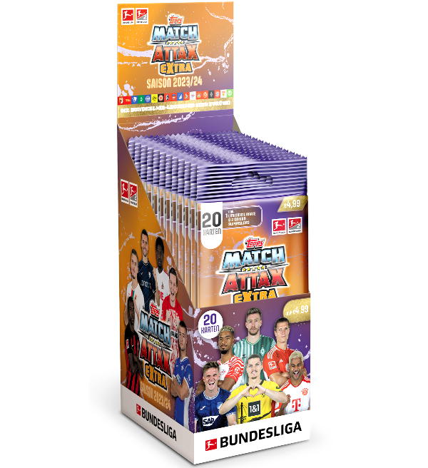 Fatpack Box with 12 packets (=228 cards + 12 Limited Edition Cards) for Topps Bundesliga Match Attax EXTRA 2023/24 Trading Cards collection.