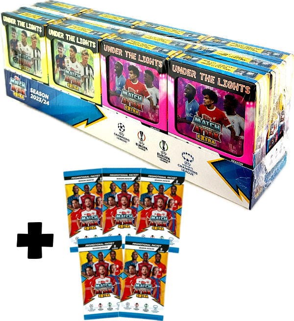 Booster Tin Display (=12 Tins) + 5 Bonus Packs (=25 Cards) of the Topps Champions League Match Attax 2023/24 EXTRA Trading Cards collection. Each Tin contains 40 cards + 3 Exclusive Limited Edition Cards.
