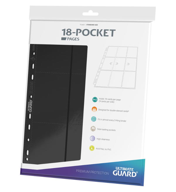 High-quality, double-sided binder pages (18 pockets, 9 pockets on the front and back), suitable for almost any ring binder thanks to 11 holes with a double-reinforced hole strip. Each pack contains 10 pages for the transport and safekeeping of a total of at least 180 cards (18 per page) in two sleeves (double-sleeved).