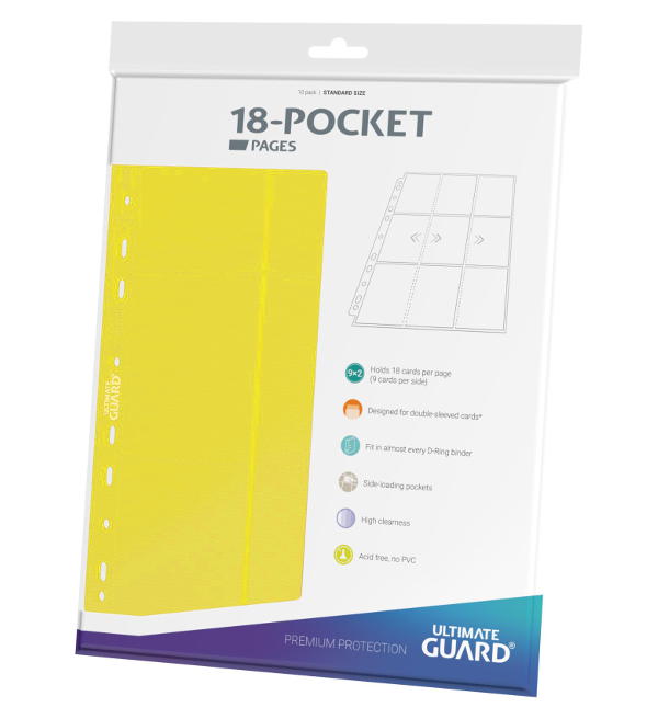 High-quality, double-sided binder pages (18 pockets, 9 pockets on the front and back), suitable for almost any ring binder thanks to 11 holes with a double-reinforced hole strip. Each pack contains 10 pages for the transport and safekeeping of a total of at least 180 cards (18 per page) in two sleeves (double-sleeved).