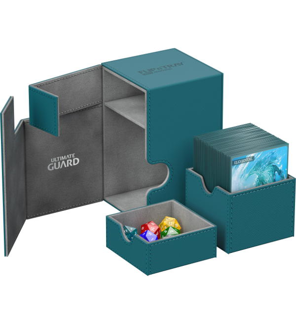 Premium XenoSkin card box with magnetic closure and card and dice trays for the protection and archival safe storage of double-sleeved cards in standard size (Cards and dice not included).