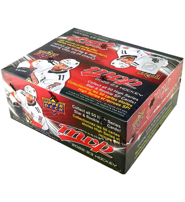 Box with 36 packets for "Upper Deck NHL 2022-23 MVP Hockey" Trading Card collection. Each booster contains 6 cards, which makes a total number of 216 cards per box.