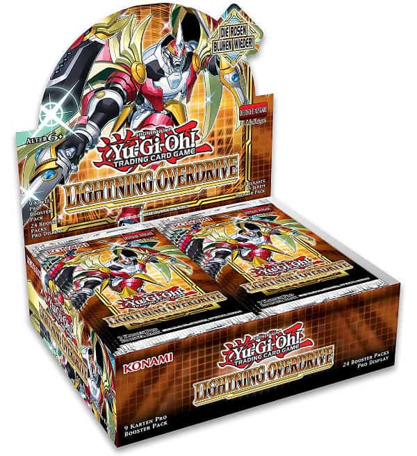 Box with 24 boosters of "Yu-Gi-Oh! Lightning Overdrive" trading card series. Each booster contains 9 cards, which makes a total number of 216 cards per box.